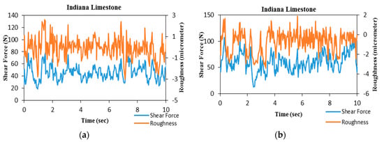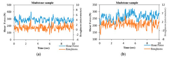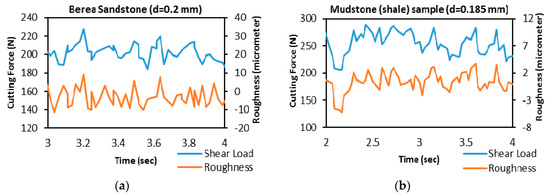 The shear force and the groove roughness variation during the cutting process: (a) Berea sandstone (DOC = 0.2 mm), (b) Mudstone (DOC = 0.185 mm).