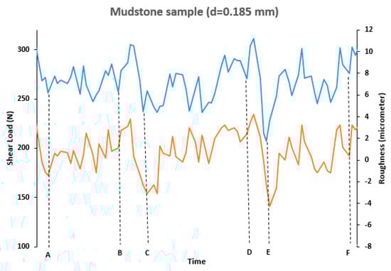Figure 6 represents the shear force and the surface roughness of mudstone rock sample values during a scratch test. At the beginning of time A, the cutter starts to compress the surface and creates a crushed zone until time B (see Figure 7a). During this time interval, cutting force and surface roughness numbers exhibit small fluctuations. After this period, the cutting force rises and reaches its peak between time B and C. As a result, a major crack defining the chip in front of the cutter is formed (see Figure 7b). Another proof for this explanation is seen in the change of roughness magnitude. The surface roughness value stays within a small range before chipping begins, but the sharp increase of the cutting force causes a big altitude change in surface asperities. After a crack is expelled from the rock surface, the cutting force reduces, and the cutter moves very fast in a short time due to inertia (see Figure 7c). This chip removal leads to deep damage on the groove surface, so it makes for a significant change in surface roughness in this part. After time C, this process as outlined above repeats. In this graph, the time interval between A and B, C and D, and lastly E and F illustrate the ductile failure mode (a smooth cut path), while the results at intervals from B to C and D to E display examples of brittle failure (the groove surface is rough).