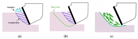 The schematic picture of cutter and cuttings during the scratching rock sample: (a) the cutting type is a powder; (b) major cracks are formed; (c) the chips are formed in front of the cutter.