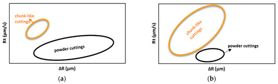 Lastly, Figure 23 illustrates two examples of the versus graphs to show cutting type changes with increasing DOC. The amount of powder type cuttings indicates that the failure mechanism is ductile at d = 0.4 mm, while chips are seen, although their number is few. After passing the critical DOC, this situation reverses, and the chunk-like cuttings comprise the majority of the debris. As seen in Figure 23b, the amount of powder type cuttings is negligible compared to the number of chunk-like cuttings at deep DOCs.