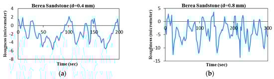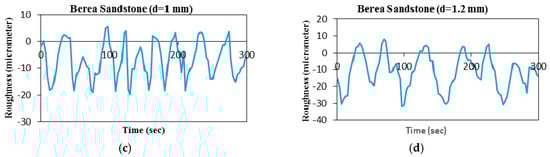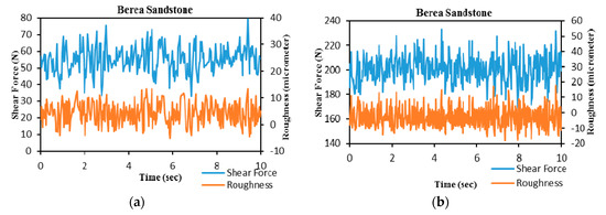 The scratch tests are conducted with different DOCs. First, the Berea sandstone sample is scratched by a rectangular sharp cutter at 0.15, 0.175, 0.2, and 0.3 mm depths, then shear forces and corresponding surface roughness are recorded during these tests are presented in Figure 10. These results not only follow the approach of Detournay and Defourny [12] (i.e., the mean tangential load increases with the DOC) but also reveal the inverse relationship between the DOC and groove asperities (see Figure 11a,b). For example, one may notice that when changes in shear force values during scratching the rock sample are small, the cut surface is smooth, but the roughness value of the groove shows notable fluctuations while the tangential forces display large fluctuations. Another important outcome of these tests is that roughness and the cutting force follow the same pattern during the cutting process. Additionally, these lab results illustrate that the averaged roughness value also follows a downward trend with increasing DOC (see Figure 11b).