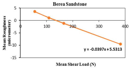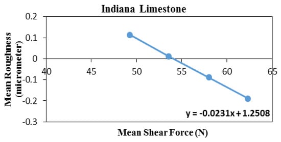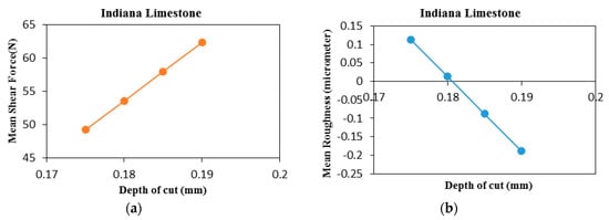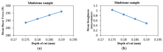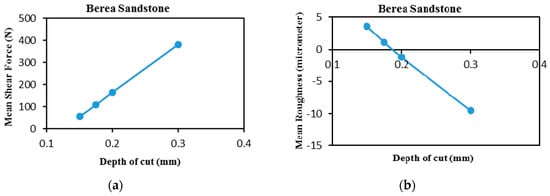 It is known that the mean cutting force increases with the rising DOC; this relation is represented in Figure 25a. Additionally, the average surface asperity has been calculated for each DOC to determine the relationship between the mean cut groove roughness and DOC (as seen in Figure 25b). A remarkable result to emerge from these experimental results is that there is an inverse correlation between the average shear load and the mean surface asperity during the mudstone cutting process, similar to that of Berea sandstone and Indiana limestone scratch test results (see Figure 26).