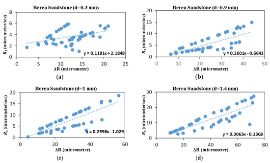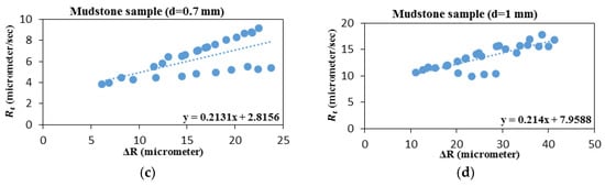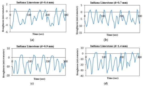 The , which presents the average change in the surface roughness, is calculated along the grooved path and then versus graphs are used to better illustrate surface topographic variations (see Figure 14). If and are small, it means that the cutter scratches the rock surface in powders, which is a result of the ductile mode failure. As illustrated in Figure 14a, shallow DOCs have small values and this number increases with rising the DOC. On the other hand, large chips are the main components of debris when the DOC is deep enough (see Figure 14c,d). As explained previously, the groove surface altitude change between two points has a positive correlation with increasing DOC. Figure 14 also confirms that ΔR varies in the range of 0–20 µm at small DOCs, whilst it reaches to about 80 µm when the depth of cut increases.