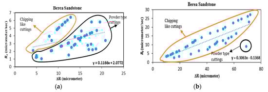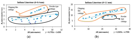 In addition, sometimes DOC variations do not affect the slope of the versus ΔR graph, or it shows a significant rise at only few points. This behavior depends on cutting type during the cutting process. At shallow depths, powder is the dominant cutting type, and the number of chunk-like cuttings is small, so the slope of this graph remains almost constant even though and values change constantly. However, this trend diminishes with an increase in the number of chunk-like cuttings. Beyond the transition point, the number of chunk-like cuttings increases, and the slope experiences a sharp increase. In parallel, the groove surface roughness shows significant changes in a short time. These variations further increase as DOC rises. The upward trend of versus ends after complete transition to brittle mode, so and maintain this trend. Another important observation from this graph is that there are two different linear trends, representing powder cutting tests and chunk-like cutting tests, so the cutting mode transition happening with the rising DOC is crucial in identifying the failure mechanism transition in the rock cutting process (Figure 15).