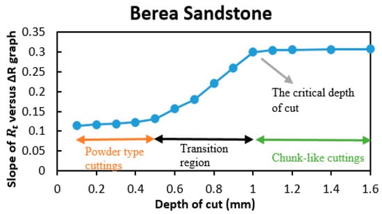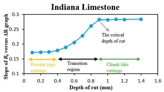 This behavior can be explained using the debris type of the cutting process. At the beginning, there are powder type cuttings throughout the entire test. Powder particles are too small; thus, it cannot cause much resistance against the cutter movement. As a result, small cutting force fluctuations would lead to small changes in and and, consequently, the slop of the graph (see Figure 22). However, the chipping type deformation causing significant surface changes after 0.4 mm DOC and, as the result, the slope of the graph goes up significantly until it reaches the critical DOC, which is the endpoint of the transition zone. In this region, powder and chunk-like cuttings are produced simultaneously. Beyond this depth, cutting debris consists mainly of chips and and show similar changes. As detailed in Figure 22, the critical DOC for Indiana limestone is found to be 0.9 mm. This value is consistent with previous results. Che et al. [21] used a high-speed camera to determine the transition DOC in Indiana limestone samples ranging between 0.7 mm and 1 mm.