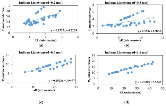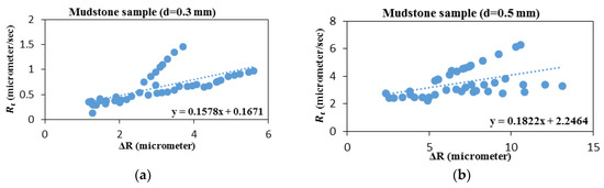 Based on our data, it can be easily verified that the change in groove roughness depends on DOC, which is the main motivation in this paper. To assess its validity, (the average change in the surface roughness) and (the difference in surface roughness between two points) have been calculated for various DOCs (see Figure 28). It is plausible that these values will grow as the DOC increases. Moreover, they are a good indicator in defining the failure regime of rock. Additionally, the slope of the vs. stays constant at the beginning, before increasing sharply in the middle, and then leveling out again at the end.