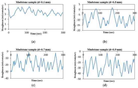 As mentioned previously, our tests suffers from the capacity limitation of the load sensor. This drawback prevents running experimental scratch test above the 0.19 mm DOC for this type of rock. At this point, the reported mean tangential force for each DOC in Mudstone sample in the literature is employed and combined with the correlation shown in Figure 26 to obtain the average surface asperity for each DOC. Then, Equation (13) is used to replicate cut rock surface asperities from 0.1 mm to 1 mm DOC. The resultant rock surfaces for DOC ranging from 0.1 mm to 1 mm are generated (e.g., see Figure 27). Fluctuations are small at shallow depths, while the rock surface experiences steep fluctuations at deep DOCs.