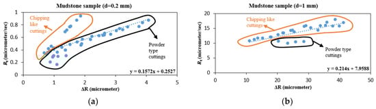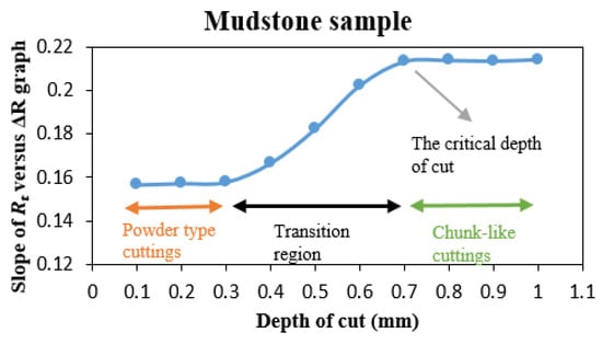 It is expected that data points separate into two trends in the and ΔR graph. The upper trend of this graph belongs to chunk-like cuttings since the roughness of cut surface changes remarkably over a short time. The lower group represents powder type cuttings during the rock cutting process, owing to the smooth surface roughness. In the small DOC of the rock cutting process, lower part points would dominate. However, this density falls off, and some dots show up on the upper side with rising DOC. This trend continues until reaching the transition point. Beyond the critical DOC, upper side points are much denser than the lower side ones (see Figure 9). The number of the chips is negligible at small DOCs, where so the slope remains almost steady. Later, chunk-like cuttings start to dominate the graph and the slope of the line goes up sharply until reaching the critical DOC. Then, the slope levels out again because the failure mechanism turns to the brittle mode (no powder cutting). As a result, the slope of and chart versus the DOC graph is another way to determine the critical DOC.