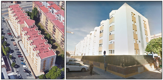 To assess the influence of improving façades on the energy and environmental performance of buildings in Spain within the context of climate change, a case study representing a large percentage of Spanish building stock was selected. A residential building built in 1981 was selected. Figure 2 shows photos of the case study. This building was constructed according to the basic building norm NBE-CT 79 [28], characterized by having narrow insulating material layers in their envelopes [28]. As Table 1 indicates, the design of the façade is constituted by a double-leaf brick with an air gap and insulating material of 2 cm, whose thermal transmittance value is 0.73 W/(m2K). Experimental campaigns were conducted according to International Organization for Standardization (ISO) 9869-1, thus validating the thermal transmittance value of the façade. The building had 5 floors, with 24 dwellings in each. The surface area per floor was 1305 m.