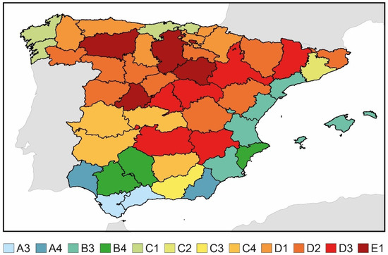Spain has a wide climate variability. These variations in climate between cities could result in huge variations in building energy performance. To control this aspect, the Spanish Technical Building Code established a climate classification according to the combination of two indicators: winter climate severity (WCS) and summer climate severity (SCS). WCS and SCS are determined by the relationships between the degrees of winter and summer days and the number of hours of sun. A fundamental aspect when obtaining these indicators is that WCS is related to the months between October and May, and SCS to the months between June and September. After determining the value of WCS and SCS, the class that corresponds to the region was determined with the values included in Table 4. A total of 12 various combinations were obtained in the country by combining WCS and SCS. Figure 4 shows the climate zones of the provincial capitals in Spain. Each climate zone was also analyzed. For this purpose, 12 cities corresponding to each climate zone of the Spanish Technical Building Code were selected: Malaga (A3), Almeria (A4), Murcia (B3), Seville (B4), Bilbao (C1), Barcelona (C2), Granada (C3), Caceres (C4), Oviedo (D1), Girona (D2), Albacete (D3), and Soria (E1). In addition, Meteonorm was used to obtain the climate data of these cities. Meteonorm is a software composed of 8325 weather stations, by which the EnergyPlus weather (EPW) files of the locations selected were obtained. Through this process, EPW files were generated for current and future scenarios throughout the 21st century. The A2 scenario from the Intergovernmental Panel on Climate Change was selected to generate the future climate files because this scenario is among the most unfavorable [32], with an increase between 2 and 5.4 °C in 2100 in comparison with the values from the beginning of the 21st century. Through this scenario of emissions, the EPW files were generated for 2030, 2040, 2050, 2060, 2070, 2080, 2090, and 2100.