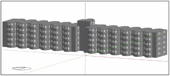 The data described in the previous subsections were used to model the building in DesignBuilder. Figure 5 shows the obtained building model. Two operational patterns were defined: (i) in the case of teleworking users; (ii) in the case of users working outside their homes. This division is the result of changes in working conditions due to the COVID-19 pandemic [26] in which building users working in offices are now more likely to telework from home. To reflect this aspect, the residential profile established in the Spanish Technical Building Code was adapted [33]. Table 5 presents the profiles used. The maximum values of loads correspond to those defined in the Spanish Technical Building Code. For the characteristics of heating, ventilation and air conditioning (HVAC) systems, dwellings were considered to have a heat pump with an energy efficiency ratio (EER) of 2.00 and a coefficient of performance (COP) of 2.10.