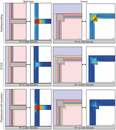 Thus study first assessed the linear thermal transmittance of the thermal bridges in the building. For this purpose, two-dimensional transitory simulations of the thermal bridges of both the slab front and the pillar located at the corner were performed, both with the original design of the building and with the two ECMs presented, thus obtaining the linear thermal transmittance. Figure 6 includes the results obtained from the simulation process of the thermal bridges. The building presented a major heat transmission in the thermal bridges that could contribute to a diminished energy performance of the building. The linear thermal transmittance of the slab front was 0.855 W/(mK), and that of the protruding corner with pillar, which would be a negative value in a case where there was no material of other thermal properties, was 0.155 W/(mK). These junctions therefore contributed to a greater building energy demand. If one of the two presented ECMs were used, their effects on the linear thermal transmittance of junctions would be different. On the one hand, the implementation of an ETICS in the building was an optimal solution to improve the thermal transmittance of the façade and to mitigate the linear thermal transmittance of the thermal bridges, obtaining a value of 0.124 W/(mK) in the slab front and −0.001 W/(mK) in the corner. On the other hand, the internal plasterboard had different tendencies in the two thermal bridges: the lowest linear thermal transmittance value was obtained in the corner, and the linear thermal transmittance value was increased in the slab front in comparison with the value obtained in the existing building. Although ETICS and the plasterboard resulted in a similar improvement of the thermal transmittance of the façade, their effects on the thermal bridges could lead to different energy performances.
