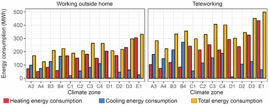 Regarding the future tendency of the energy performance of the building, the climate evolution expected throughout the 21st century will progressively reduce heating energy consumption and increase cooling energy consumption. Consequently, the relationship between climate zones and the greatest energy consumption will vary throughout the 21st century, and at the end of the century, the hot zones B3 and B4 will obtain similar values of energy consumption to that of zones D3 and E1, which are the zones with the greatest value in the current scenario. This aspect increased the energy consumption of the hottest zones between 30% and 33%, while reductions between 5% and 17% were obtained in the coldest zones. Thus, it is obvious that the energy performance and impact of Spanish building stock will vary throughout the century, with the buildings located in the hottest climate zones being more important. This aspect will also depend on the operational pattern of users. In general terms, teleworking was found to increase energy consumption between 51.4% and 66.1% by 2050, and between 51.9% and 68.6% by 2100. Thus, new use tendencies could generate a greater environmental impact and greater greenhouse gases emitted to the atmosphere, increasing the effect of climate change.