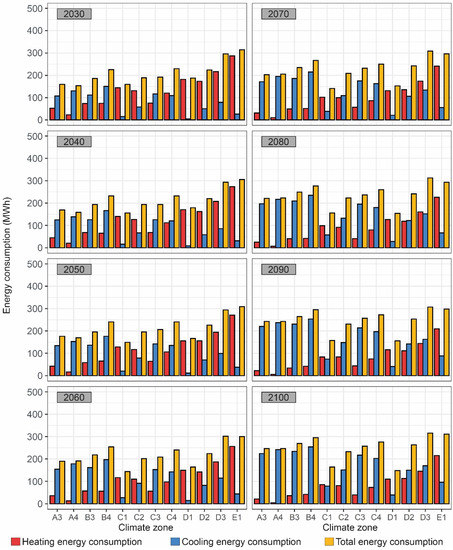 The energy performance obtained in the building was analyzed by improving the façade. However, the energy performance of the building was first assessed in the climate zones in Spain, both in the current scenario and throughout the 21st century, with the A2 climate change scenario. Figure 7 includes the yearly results of the current scenario, and Figure 8 and Figure 9 show the yearly results of the climate change scenario. Two operational patterns were considered according to the new working tendencies as a result of the COVID-19 pandemic: working outside the home and teleworking. According to this operational pattern, the intensity of the energy demand of the building will be greater with teleworking users. An analysis of the results determined how the energy performance of the building in the current scenario was different according to the climate zone, with greater energy consumption in the coldest climate zones. The climate zones with a greater WCS were characterized by obtaining the greatest energy consumption because of the high heating energy consumption. However, the combination of the winter climate zones C and D with zones of high SCS obtained the highest combinations of energy consumption in the country, except zone E1. The climate classification in Spain is made independently for winter and summer, so there could be very cold regions in winter and very hot regions in summer. The climate zones C3, C4, and D3 obtained a greater energy consumption following zone E1. In some regions, high cooling energy consumption could also contribute to high energy consumption at the end of the year. In this regard, zones with a low severity in winter, such as climate zones B3 and B4, obtained high energy consumption values. In general terms, this energy consumption value surpassed 10 MWh, which corresponded to emission values greater than 3.57 t equivalent CO2. Likewise, the significant rise in users teleworking in their dwellings considerably increased the energy consumption of the building. The increase generated in energy consumption with respect to an operational pattern in which individuals worked outside was between 63.5 and 339.8% for cooling energy consumption, between 39.1 and 46% for heating energy consumption, and between 46 and 78.6% of the total energy consumption. Thus, the influence of new working conditions established as a result of the COVID-19 pandemic could significantly influence the energy performance of building stock and the possibility of energy poverty. These results showed that greater use of the building could increase its energy consumption by up to 78.6%, thus generating greater energy expenditure for family units.
