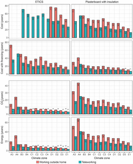 These variations in the savings of energy consumption obtained with the ECMs and the operational patterns affected the payback periods expected with the measures and savings in CO2 emissions. To assess this aspect, the payback period required to recover the economic cost of the implementation of the ECMs was analyzed, as well as the recovery of the energy and CO2 emissions produced by the ECMs in the stages of manufacture, transport, and implementation in the building. As the energy simulation data corresponded to the EPW files generated and were coincident with each decade of the 21st century (e.g., 2030 or 2040), linear interpolations between each decade were conducted to obtain the economic, energy, and CO2 emission savings achieved in each year. Figure 10 shows the number of recovery years required. Recovery periods presented different values according to the climate zone, the type of ECM, and the operational pattern. In general terms, the determinants that allowed greater energy savings to be obtained (cold climate zones and teleworking) contributed to shorter recovery periods. As for the economic recovery, plasterboard was the ECM with the greatest facility of economic recovery due to its low price; thus the years of economic recovery oscillated between 13 and 55 years with teleworking, and between 23 and 71 years with working outside the home (economic recovery was not possible in zone A4). These data contrasted with those of ETICS, which presented longer recovery periods (between 27 and 71 years with teleworking and between 46 and 77 years working outside the home), with difficulties for the economic recovery in many climate zones. However, the possibilities of financing through aid, such as the financing program for energy rehabilitation in the State Housing Plan in Spain, reduced the payback periods of the economic cost of the ECMs. This plan achieved reductions of 40% in the economic cost of the investment, so the amount that users should amortize is 60%. With this reduced value of the economic cost of the ECMs, the payback period obtained with ETICS presented values similar to those obtained with the plasterboard without financing. However, in the plasterboard, the financing reduced the number of years required and the possibility of economic recovery in all the combinations of climate zones and operational patterns. Based on these results, the plasterboard constituted an interesting ECM from an economic point of view because of its possibility of rapid economic recovery in comparison with ETICS. Nevertheless, the recovery of the energy and the CO2 emissions generated in the manufacture, transport, and installation of the ECMs was lower with ETICS. The reasons were as follows: (i) the greatest value of energy and emissions generated by the plasterboard was mainly due to the manufacture of the laminar plaster plate; (ii) the greatest energy saving was achieved with ETICS. The combination of these two aspects meant that the recovery period of CO2 emissions oscillated between 3 and 24 years with ETICS, and between 6 and 44 years with the plasterboard. Finally, and regarding this last aspect, the percentage saving in CO2 emissions achieved with both ECMs in 2050 with respect to emissions in the current scenario was notable. As Table 10 shows, the emission savings obtained with ETICS oscillated between 6.9% and 36.7%, so these values were far from the general goals of 90% set in the roadmap towards a low-carbon economy by the European Union [4]. These results are in accordance with the indications included in various works related to limitations in the modernization of façades [29]. Although the improvement of the envelope clearly reduces the percentage of CO2 emissions of the building, combining this measure with others, such as a more intelligent use of HVAC systems [40], self-consumption [41], and a greater generation of electrical energy with renewable sources at a national scale [42], is required. The combination of these measures, together with the improvement of the envelope, would more easily achieve a low-carbon building stock. Nonetheless, the role of the thermal bridges should be considered in these energy improvements. Based on the results obtained, an improvement of the envelope focusing only on obtaining a low thermal transmittance value could be an inappropriate option if, due to design reasons, the linear thermal transmittance of the thermal bridges is not reduced or is considerably increased. Both ECMs analyzed in this study obtained similar thermal transmittance values, but their effects in terms of energy saving and reduction of CO2 emissions were clearly different because of the effects generated by the thermal bridge of the slab front. For this reason, it is necessary to develop decision-making support systems that consider the possible building improvements from an interdisciplinary perspective [43,44]. These support systems could help architects and engineers to determine the most suitable ECM to achieve the sustainability goals foreseen for the entire building stock of the European Union by 2050.