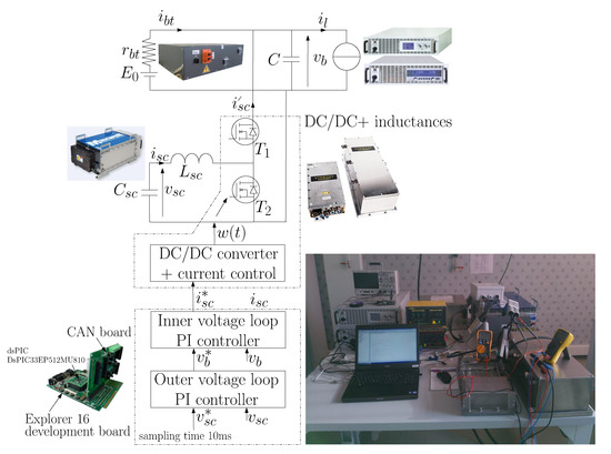 The implementation of these controllers is generally done with high-performance DSP/C with internal current/voltage controllers, PWM outputs to control the converters and its own current/voltage sensors. In such configuration, the implementation does not introduce issues. Nowadays, embedded and networked automotive bus communication such as the Controller Area Network (CAN) is widely used for vehicle networks. It is used for the communication between the controllers, the sensors and the actuators [25,26,27,28,29]. The controller can retrieve data from each component (i.e., voltage, current, temperature of the BT and SCs) and the DSP send periodic messages necessary to control the DC/DC converter [30,31,32,33]. It should be pointed out that the sampling frequency of the data on the CAN bus is relatively low compared to a regular implementation on a DSP/C that use analog inputs and the PWM peripherals [34]. In fact, in the case of a regular implementation, the CPU and the peripherals have a sampling time nearly equal to 100 μs for the inner current loops and nearly equal to 1ms for the outter voltage loops. Therefore, the performances of the controllers are not degraded by the sampling (see [3] for more information and [35,36] for theoretical details). In practice, the CAN bus data sampling frequency is defined by the manufacturers of top-of-the-shelf equipment and modifying it in a wide range is not always possible, at least in a range defined by the manufacturer.