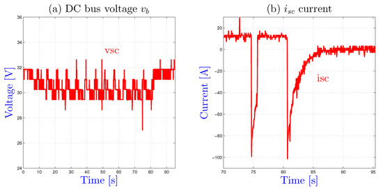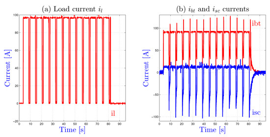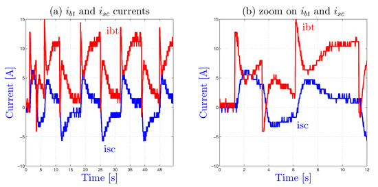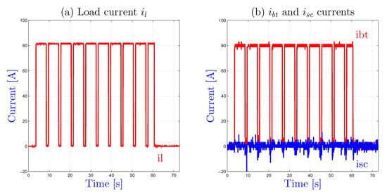 Figure 10 shows an experimental result for a load current profile composed of 5 s at 80 A and 1 s at zero current, i.e., for operating points where the battery current remains in the bounds and the SCs voltage is in the bounds (state 0). As expected, the SCs current is null and the battery supplied all the energy to the load.
