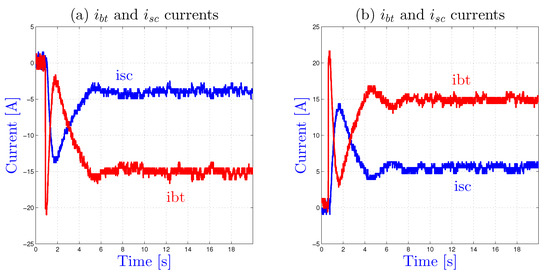 In fact the commutation from controller 2 to controller 1 needs an adequate re-initialization of the integral term of the PI controller and the commutation from controller 1 to controller 2 doesn’t introduce difficulty. When controller 1 is engaged, thanks to the initialization flag in Figure 7, the integral term S is initialized at or according to the system state. As noticed just above, this reduce the convergence time of to or through a fast drop of the battery current as shown in Figure 11b.