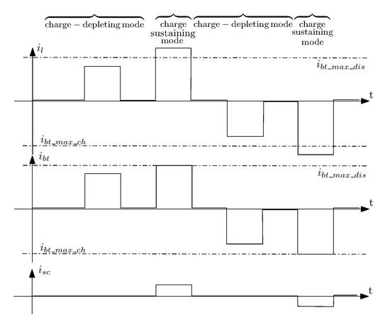 Figure 4. Charge-depleting and Charge-sustaining modes. - Whenever the battery current is out of these bounds, the controller switch to charge-sustaining mode and the surplus current is assigned to the SCs [20,24].