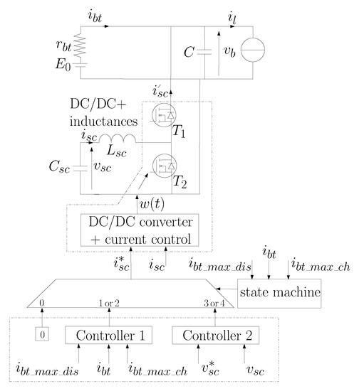 Figure 1 represents a parallel power electronic system understudy composed of only one-converter. The controller is designed to provide a smooth current transition on the source with the lower current dynamic, namely the battery in this study. Also, the power between the battery and the SCs needs to be appropriately shared to match the power load requirement. The maximal currents of the battery and SCs, the state of charge (SoC) of the SCs, the battery temperature must be taken into account as constraints in the controller design [37]. This regular controller refers to charge-sustaining mode, where SCs assist the battery during power transient and the SoC of the SCs fluctuates but it is maintained at a certain level. Consequently, the control structure is based on three nested loops as shown in Figure 1, namely: (see [37] for details about the controller design):
