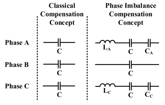 Fixed series compensation can be achieved by means of the classical compensation scheme or the phase imbalance compensation concept. In the classical compensation scheme, the transmission line with series inductance is compensated symmetrically, i.e., the capacitance of the series capacitor is the same across all three phases (see Figure 1). In contrast, the added capacitances and inductances in the phase imbalance concept are not identical to each other, as will be explained in Section 4. Furthermore, the inductances are added to the uncompensated line as part of the phase imbalance concept and are not the phase inductances of the uncompensated line.