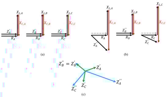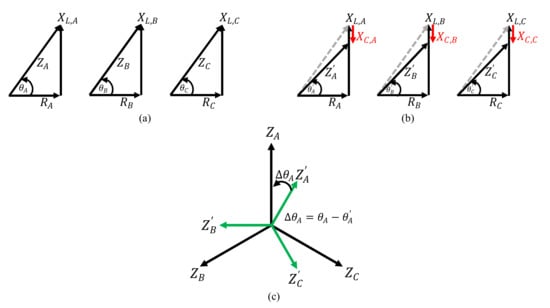 As a result of the imbalanced compensation, the resonance frequency of each asymmetrically compensated phase is different. With asymmetrical compensation deployed in phases and (see Figure 1), . The resonance frequency is then defined as Equations (8)–(10) for phase , and . Since no additional impedances are included in phase , it should be noted that .