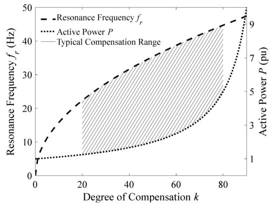 Figure 3 is derived using Formulas (2), (3) and (5) and graphically illustrates the relation between the compensation degree , the resonance frequency and the active power transfer. In practical series compensation applications, lies between 20% and 80% [19] (In exceptional cases, can be lower (e.g., the classical series compensation application in Hebei, China [20], has a -value of 6.67%), which leads to an increased active power transfer of 1.25–5 p.u. and results in resonance frequencies, as seen from a point of interconnection to the transmission network, between approximately 22 and 45 Hz (based on fundamental frequency of 50 Hz). The actual resonance frequency will be different depending on the reactance of the connected generator. It should be remembered that is always calculated at .