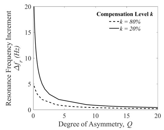 Figure 5 is derived from Equation (19) and shows different compensation levels and different degrees of asymmetry. The resulting change in resonance frequency is . Since any requires an additional series capacitor, the resonance frequency will always increase. is always positive, as is shown in Figure 5, and it is, therefore, not possible to reduce the resonance frequency below using the series resonance PIC scheme. Furthermore, for any given , is inversely proportional to .