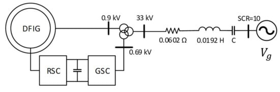 To assess the effectiveness of PIC in mitigating DFIG-SSR, the development of the power system and DFIG model is briefly described next. Due to its highly local nature, the investigation of DFIG-SSR requires a detailed model of the DFIG. Modelling of the grid is required in such a way that it excites the oscillation mode, which, ultimately, will result in the interaction between the DFIG and the grid. Therefore, many investigations on DFIG-SSR reported in literature use the topology of the IEEE First Benchmark Model [21]. The model in the current work is modified in two ways. First, the synchronous generator model is replaced by a detailed DFIG model. Second, the equivalent grid is modelled as a voltage source with a series impedance, so that the grid contains a sub-synchronous resonance point at 30 Hz, which corresponds to at 36%. The equivalent grid has a short circuit ratio of 10. The single line diagram of the power system under consideration (including all relevant network data) is given in Figure 6. Several practical studies have used similar models for investigating DFIG-SSR [22,23,24,25].
