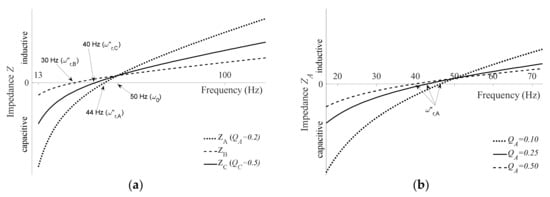 The same applies for phase and solving Equation (6) for ultimately leads to Equation (7), where represents the degree of asymmetry. This equation sets the relation between the additional inductance and capacitance in each phase that applies the PIC. For each phase, a single degree of freedom exists.