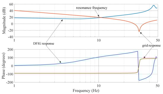 Impedance response of the doubly fed induction generator (DFIG) and transmission system. Using the impedance-based stability analysis methodology, the resonance frequency was found to be 10 Hz.