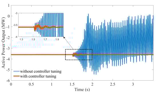 To illustrate a case where DFIG-SSR is successfully mitigated when the transmission line is equipped with classical series compensation, Figure 9 shows the response of the DFIG to a fault before and after modification of the rotor side converter controller parameters. After 1.5 s, a switching action caused the DFIG to be radially connected to the series capacitor (classical compensation), which resulted in DFIG-SSR in the case of unmodified parameters. After modification of the RSC controller parameters, DFIG-SSR was mitigated.