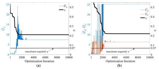 The optimisation results are given in Figure 10a for the single-phase imbalance and in Figure 10b for the two phase imbalance compensation. Approximately 3000 iterations for the single-phase imbalance compensation and 4000 iterations for the two-phase imbalance compensation were taken as sufficient to judge the optimisation’s convergence, where each iteration includes an EMT simulation. The Genetic Algorithm [31] was used as an optimisation algorithm, where the settings (e.g., initial population, mutation rate, pairing method, etc.) were chosen as recommended in Reference [32]. The influence of the algorithm’s settings on the optimisation results is out of the scope of the current work and is left as a topic for further research.