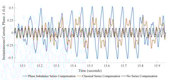 Measured instantaneous current in phase for three cases: without series compensation, with classical series compensation, and with phase imbalance series compensation.