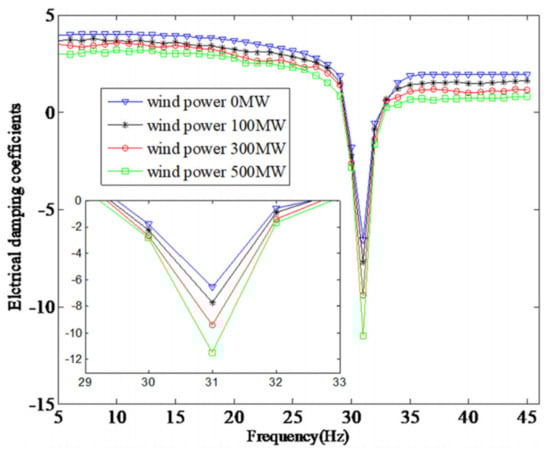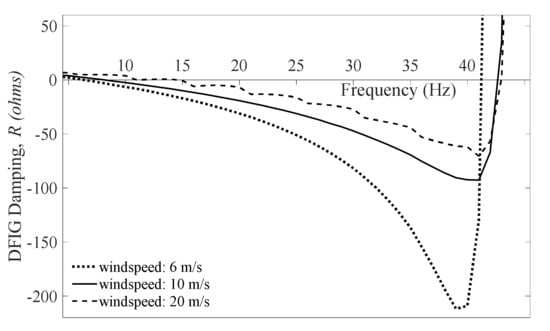 Lastly, to explain why is increasing as decreases, it is necessary to investigate the damping characteristic of the DFIG. Using the perturbation-based dynamic frequency scan [30], the damping of the DFIG was estimated at windspeeds of 6 m/s (i.e., below nominal windspeed), 10 m/s (i.e., around nominal windspeed), and 20 m/s (i.e., above nominal windspeed). The results are given in Figure 12.