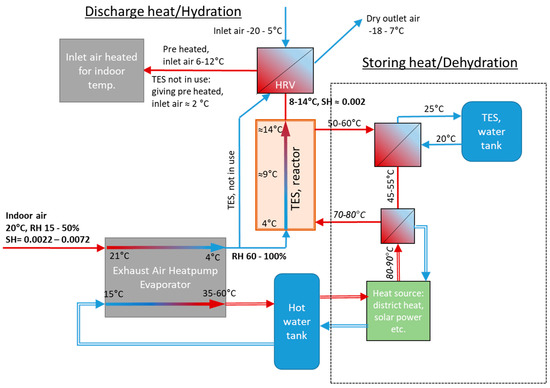 Several concepts of TES by chemisorption include some type of reactor for heating inlet air directly or indirectly via heat exchange with exhaust air [14,15]. Very low indoor relative humidity (RH) during a heating period compromises the storage capacity, depending on the TES material(s) used [8,10]. The RH of the outlet air is increased as the temperature decreases during the heat collection in an exhaust air heat pump (EAHP). The concept based on (R1) was developed and published in our earlier studies, basically consisting of a TES reactor integrated with a typical EAHP heating system according to Figure 1. The heat pump receives exhaust air and collects heat by cooling down the exhaust air to e.g., 4 °C giving a suitable 50–100% RH for the chemisorption reactor containing the mixture of NQ and SG [8].