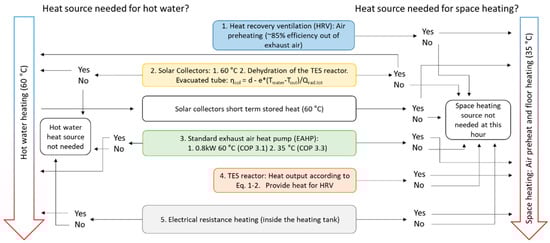 The simulation model contains five heat sources, with solar collectors and the TES reactor is added to a rather conventional EAHP heating system. The heat demand consists of tap water (60 °C) and space heating, which is accomplished by preheating the inlet air for the ventilation and floor heating. Figure 2 shows a scheme of how the model checks for whether the certain heat source is required and must be used. The TES reactor is used when all conventional heat sources are in use: HRV, EAHP and solar collectors (for which contributions are very limited during winter). To secure stable indoor temperatures, electrical resistance heat (ERH) is used during high demand. The simulations were performed with Matlab R2018b software.