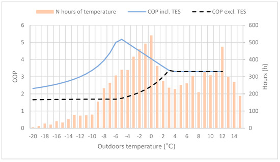 The coefficient of performance (COP) with and without the thermal energy storage (TES) reactor, and the number of hours for varying outdoor temperature.