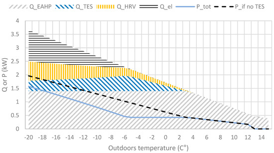 Heat sources heat output (Q) and power (P) required with and without TES at various outdoor temperatures according to the concept. Water vapour pressure implies 100% RH at outdoor temperature and moisture generated in normal in-house living conditions (showering, plants, etc).