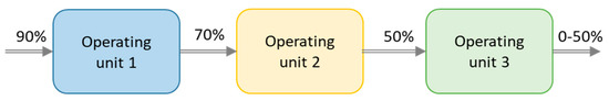 Schematic graph over the operating units (OU) connected in serial and the relative humidity (RH) of the inlets/outlets.