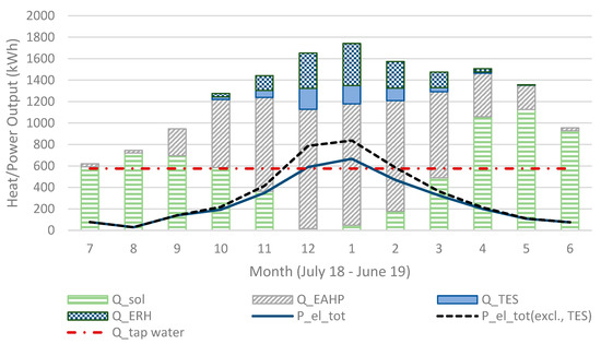 The sum of heat output (in Sim4) for all heat sources and electricity consumption for each month.