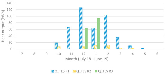 The simulation model calculates improved system behaviour during sunny winter days (or in practice a system with a smart control system) by storage of the small portions of solar power available in January–February as shown in Figure 12. Shown in Figure 2, the TES systems model algorithm shuts down when the solar radiation is sufficient, which is not necessary in a case where the solar heat could be evened out (and short-time stored) during the day, decreasing heat requirements from electrical resistance.