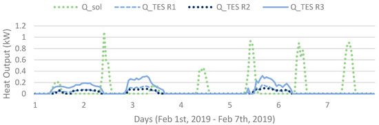 Hourly heat output (in Sim4) of each operating unit (R1, R2, R3) and obtained heat of the solar collectors for a week.
