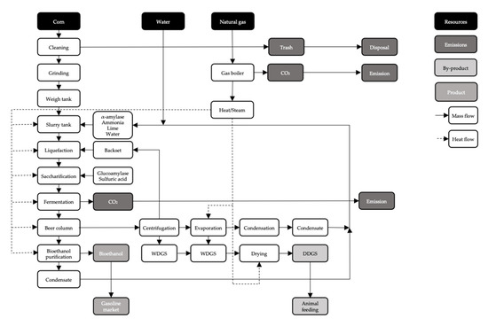 The production of bioethanol is a heat-consuming process. The heat demand for processing of corn is ~1100 MJ∙Mg−1 (corn), while the production of bioethanol requires 38,600 MJ∙Mg−1 (bioethanol). Typically, this heat demand is supplied by the incineration of natural gas, a fossil fuel [1]. Therefore, the production of bioethanol is not considered sustainable (e.g., due to net GHG production, [2]), which is dependent on fluctuating prices of natural gas and subsidies. The bioethanol production industry needs continued efforts to be profitable, sustainable, self-sufficient, and independent from the volatile fuels market and resilient to changing policies.