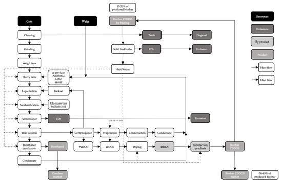 Kalyian et al. [2] developed a model of a process that integrated torrefied corn stover into the ethanol production system. The goal of this model was to assess whether there was the potential to reduce greenhouse gas emissions through the integration of biomass torrefaction into industrial-scale businesses. Our model has a different scope in comparison to Kalyian et al. [2] because the biomass we propose as a feedstock for torrefaction is a direct byproduct of ethanol production. We are using DDGS for biochar production, which, in turn, could potentially earn positive carbon abatement effects.
