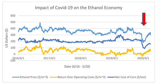 Prices of ethanol (2015–2020) [12]. A red arrow indicates an example of the recent price drop caused by the SARS-Cov-2 outbreak.