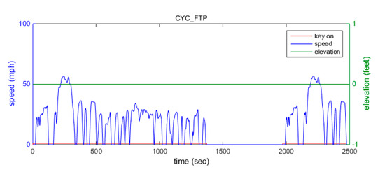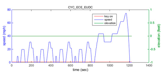 The FTP and ECE-EUDC transient cycles are considered as the base driving cycles for the analysis. These vehicle driving cycles are considered due to the fact that the vehicle under study is a light-duty passenger car and they cover the majority part of the different driving conditions that a vehicle would face during its usage [21]. The corresponding driving cycle details are as shown in Figure 2 and Figure 3.