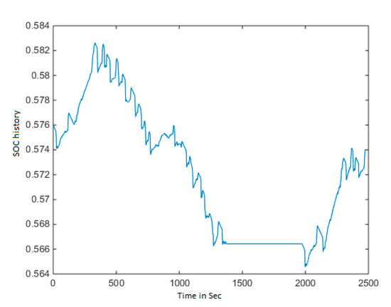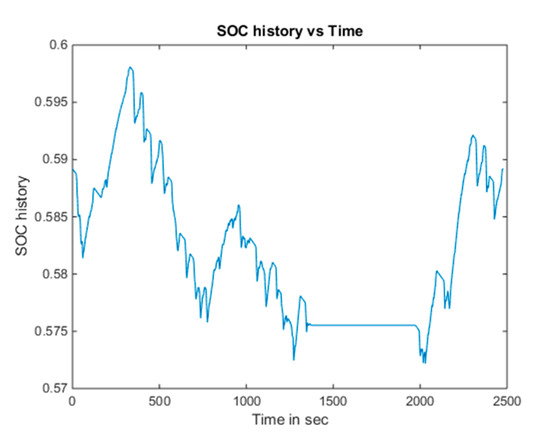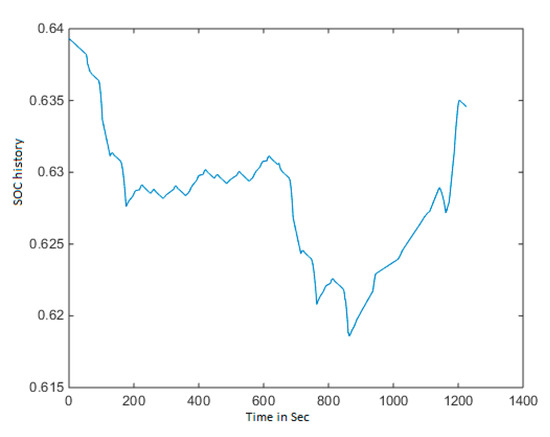 Figure 19 and Figure 20 show the vehicle performance change after optimization of its design with the MABC approach for the ECE-EUDC driving cycle, Case 1. Figure 19 shows the battery SOC variation with respect to the driving cycle, and it can be observed from the figure that variation between the initial and final value of battery SOC is less than 0.5% and SOC value lies close to 64%.