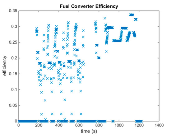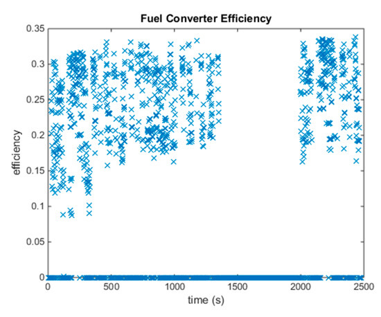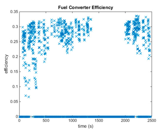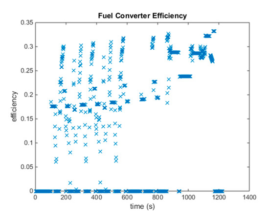 Figure 15 shows fuel converter efficiency and as it is seen from the figure, there is no big impact and the efficiency is maintained at around 24%. Because of the large variation of speeds ranging from idle to nearing 75 mph top speed in this driving cycle, the loss at lower speed is compensated.