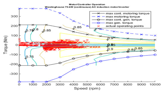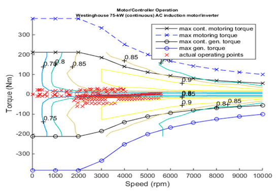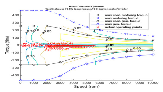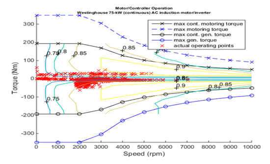 Figure 21 illustrates the electric motor torque-speed characteristics and also the limits of maximum motoring and regeneration torque. At lower rpm, the torque points lie more on the positive region, supplementing the engine operation, and at rpm greater than 2000, torque points also shift to the negative region due to regeneration operation.